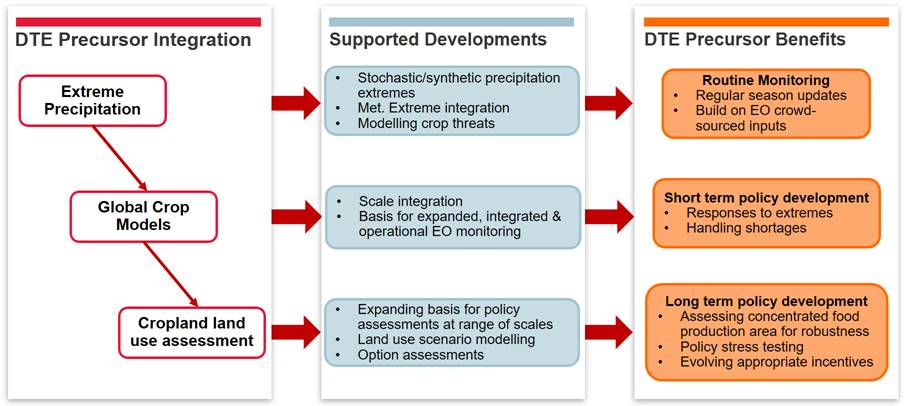 Seen as a representative problem which could be operationalised within a full Food Systems DTE implementation, this demonstration has a particular focus on how DTE can be used in predicting extreme precipitation in terms of global / regional crop yields and impact on agricultural land use. Within the context of the demonstration, we intend to focus on the modelling and visualisation aspects, generating a number of datasets which together can demonstrate some of the advantages of the DTE concept.