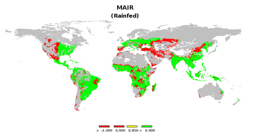 The map is calculated based on the model setup modified from Folberth et al to isolate maize harvested areas and, additionally, requiring less land per simulation unit to be freed for environmental benefits (at least 10%). This is due to the fact that a higher environmental target makes the problem infeasible, as the global maize demand would not be satisfied. In terms of achievable land sparing, this setting provides overall reduction by 20% of rainfed and 15% of irrigated maize areas.