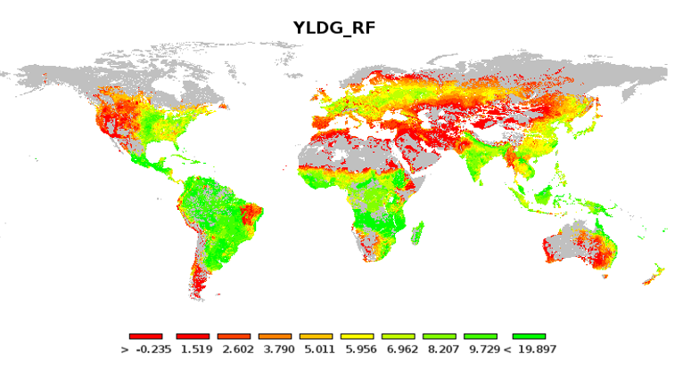 Maize annual yield potential expressed in “dry matter” t/ha/year units (YLDG) for 1990-2009 rainfed (RF) and irrigated (IR) as estimated by the EPIC model on optimized (maize-isolated) cropland mask produced for the project’s land allocation stress-testing.