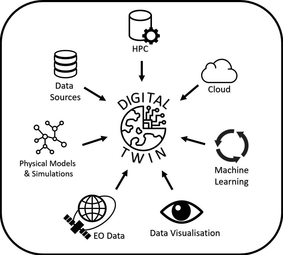 Digital Twins are normally built for a specific purpose and to enable data sharing in a community, although they are not essentially thematic. ESA’s Digital Twin Earth (DTE) initiative is an exciting and ambitious opportunity, partly driven in response to the EU Destination Earth initiative, to apply the concept of DTs using EO data for regional and global scale systems. The precursor project aims create a roadmap towards a fully integrated DTE by exploring Digital Twins in a range of thematic areas: